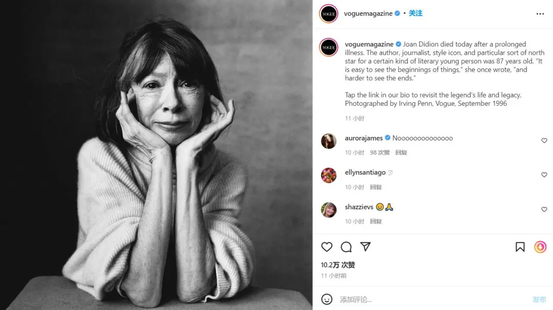 (详见《华丽志》:两位曾为《VOGUE》工作的杰出女性去世:前主编 Grace Mirabella 和女作家 Joan Didion)