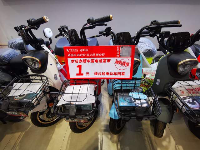 一进门,醒目的红底色宣传文案就引起了我的注意,在该店办理中国电信宽带就可以1元把台铃电动自行车带回家。这不正是去年12月初朋友打电话咨询的那个活动嘛!看来,这个活动已经全面铺开,不需要四处打听了。