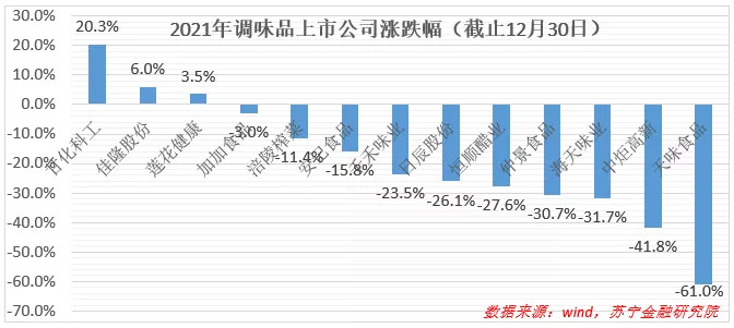 2021年,调味品板块让投资者很受伤。以中信调味品指数来看,年初至12月30日(下同),全年下跌30.28%,大幅跑输市场大盘。同期,代表全部A股的万得全A指数上涨8.52%,具体来看,代表大盘股的沪深300下跌5.56%,代表中小盘股的中证500上涨14.82%。
