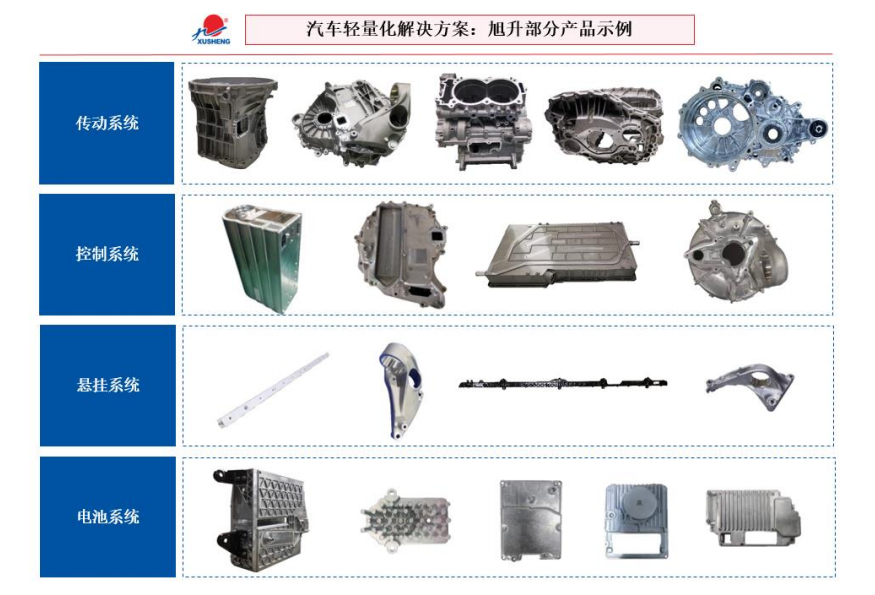 旭升股份主要从事精密铝合金汽车零部件和工业零部件的研发、生产和销售,产品主要应用领域包括新能源汽车变速系统、传动系统、电池系统、悬挂系统等核心系统的精密机械加工零部件。