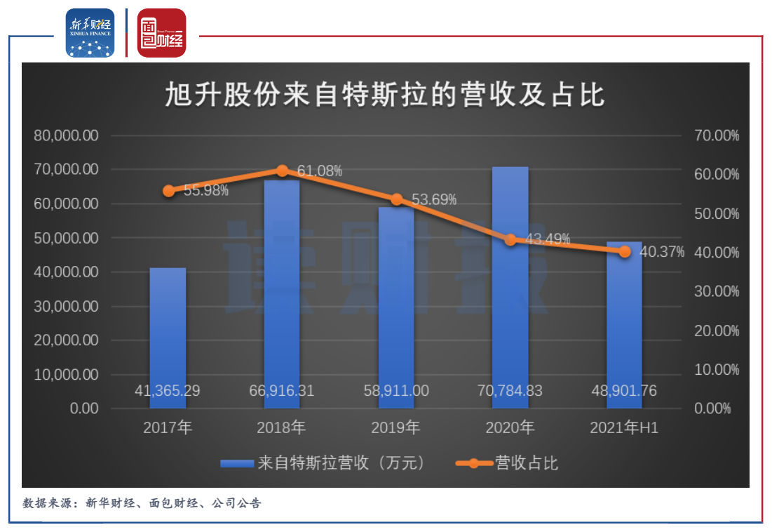 图3:2017年至2021年上半年末旭升股份来自特斯拉的营收及占比