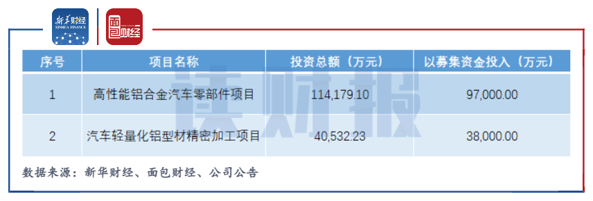 高性能铝合金汽车零部件项目计划总投资11.42亿元,项目建设期为36个月,拟通过新建厂房及生产线的方式新增新能源汽车传动系统壳体产能234万件、新能源汽车电池系统部件产能57万件和新能源汽车车身部件产能50万件;汽车轻量化铝型材精密加工项目拟新增新能源汽车传动系统壳体产能62万件、新能源汽车电池系统部件产能95万件。
