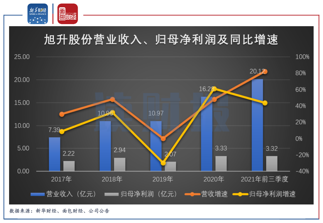 图2:2017年至2021年前三季度旭升股份营业收入、归母净利润及同比增速