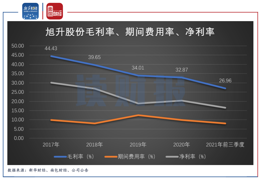 图4:2017年至2021年前三季度旭升股份毛利率、期间费用率、净利率