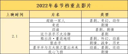 在此前的文章(回顾:《一个春节档能装进多少新片?》)中,我们曾对2022年春节档进行先期前瞻。伴随时间一步步临近,春节档格局也基本尘埃落定,锁定在8部重点项目之间。