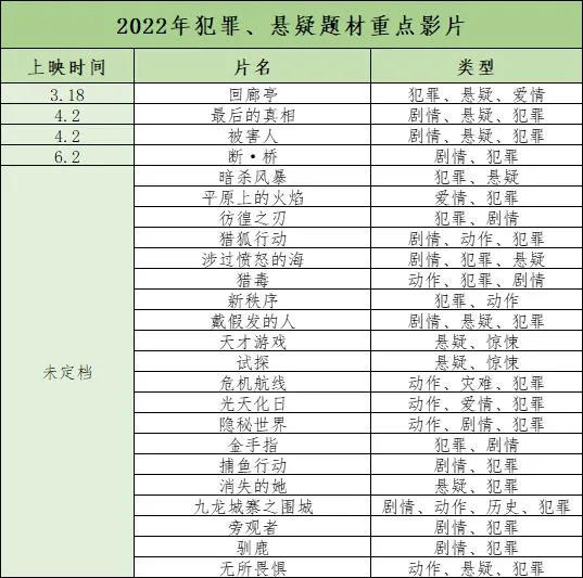 作为类型片的代表性题材,犯罪、悬疑电影在国内电影市场一直处在高产频段。在我们统计的片单中,犯罪悬疑类新片数量达到了24部,在各类项目中位居前列。