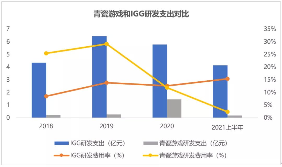单从研发投入来看,两家公司的选择截然相反,IGG继续加大研发投入,而青瓷游戏研发投入反而出现了缩减的迹象。2021年上半年,青瓷游戏研发投入仅1800万元,金额还不及2018和2019年。