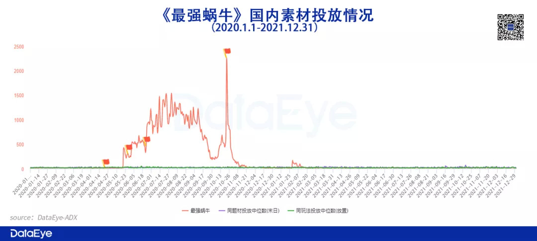 对于这两个爆款游戏,笔者发现上线不到两年的《最强蜗牛》在国内的投放素材总数竟然超过了上线5年的《王国纪元》!