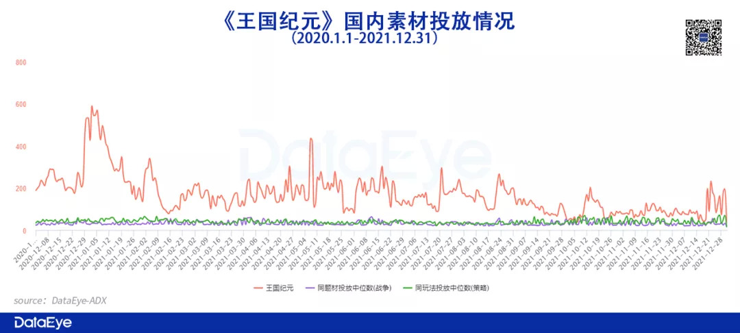 从素材投放量来看,《王国纪元》和《最强蜗牛》的素材投放量均远超同题材、同玩法投放中位数。