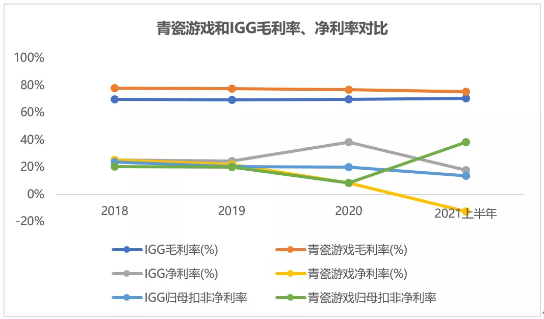 IGG营业收入领先青瓷游戏4倍,扣非归母净利润只领先1倍,很显然,青瓷游戏利润端表现好于营收端。