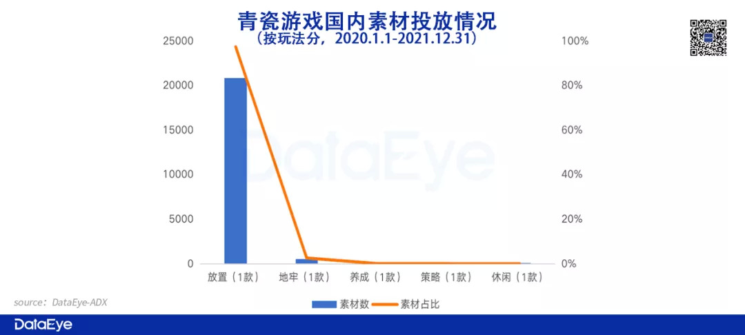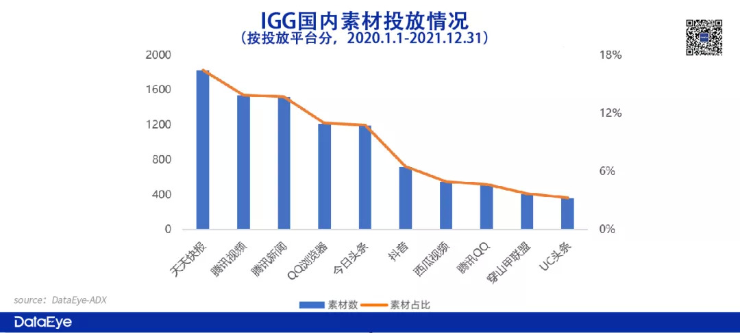 青瓷游戏主推的放置类游戏《最强蜗牛》,单款游戏投放了2.08万广告素材,占比高达97%。而IGG旗下策略类游戏《王国纪元》投放了7000多组素材,占比高达96.73%。