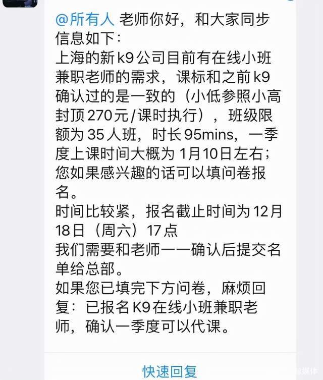 学而思老师在小红书上传的相关截图显示,上海的新K9公司尚有在线小班兼职老师的需求,上课时间大概为(2022年)1月10日左右,报名截止时间为12月18日(周六)17点。