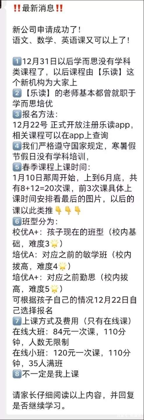 而也正是从这一天开始,有家长接到了学而思方面老师的通知,称新公司申请成功了,语文、数学、英语课又可以上了:原学而思K9阶段的学科类课程将由“乐读”这个新机构为大家上,并称“乐读”的老师基本都曾就职于学而思培优。
