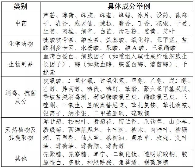 根据规定,“09-02-03物理降温设备”“09-03-08光治疗设备附件”“14-10-02创口贴”“20-03-11穴位压力刺激器具”中的产品不能含有中药、化学药物、生物制品、消毒和抗菌成分、天然植物及其提取物等发挥药理学、免疫学、代谢作用的成分或者可被人体吸收的成分,包括但不限于下表所列成分。