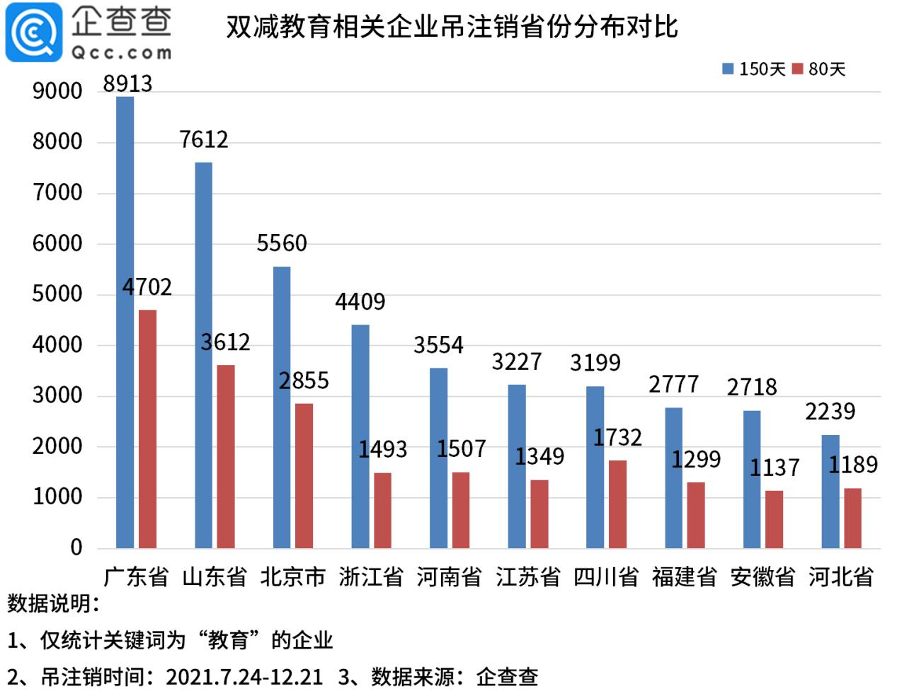 从地域分布来看,企查查数据显示,随着时间的推移以及各地政府的积极配合,“双减”落地以来的150天内,各省相关企业吊注销量相较于“双减”落地80天期间数量分布普遍翻了一倍。广东省数量仍是最多的,达8913家;山东省以7612家位列第二。浙江省吊注销量变化最大,达4409家,是“双减”落地80天期间数量的3倍。