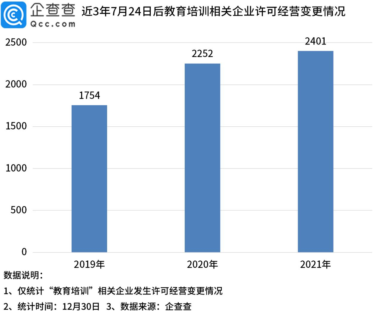 企查查数据显示,近3年(7月24日之后)教育培训相关企业发生许可经营变更的企业数量逐年递增,2019年达1754家,2020年同期达2252家,同比增长28%。2021年7月24日“双减”落地后,发生许可经营变更的企业达2401家,同比增长7%。