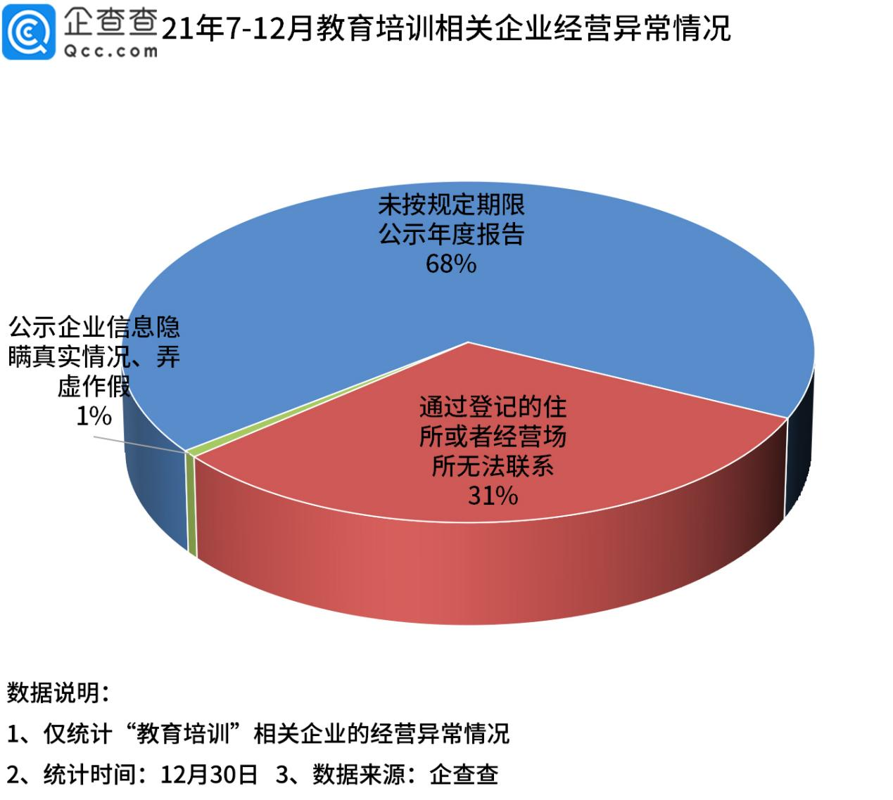 具体从21年7-12月教育培训企业列入经营异常的原因来看,企查查数据显示,68%的企业列入经营异常的原因为“未按规定期限公示年度报告”;而31%的企业则因为“通过登记的住所或者经营场所无法联系”被列入经营异常,1%的企业因为“公示企业信息隐瞒真实情况、弄虚作假”而被列入经营异常。