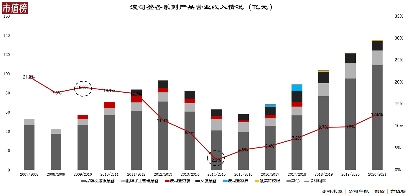 可以看到,波司登多元业务的种种尝试只让收入实现了短暂回升,而后再次陷入低迷,如果以利润的角度考量,其净利率迅速滑落,从18%的水平下降至不到3%。