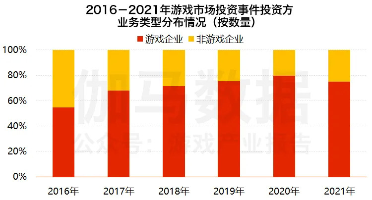 伽马数据(CNG)对2016年至2021年游戏市场投资方业务类型分布的统计数据显示,投资方为游戏相关企业的投资事件数量占比逐年增高。