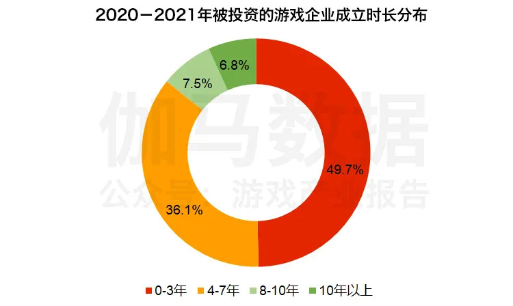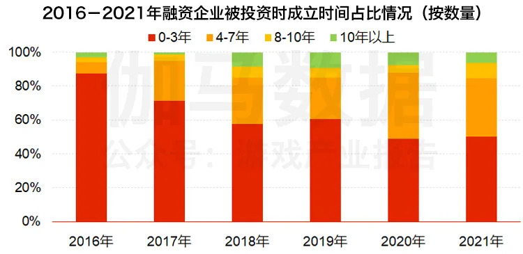 从伽马数据(CNG)对2016年至2021年国内游戏市场融资企业的成立时间统计来看,成立时间在四年到七年的游戏企业受到的关注度提升。虽然被投资时成立时间在三年以下的企业数量占比在下降,但是占比仍在半数以上,投资方对于成立三年以下的初创游戏企业仍然有着较高的关注度。