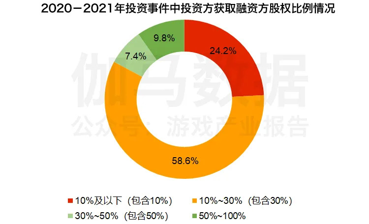 从伽马数据(CNG)对2020年至2021年游戏市场融资企业的成立时间以及投资方获取的股权比例统计来看,在近两年的游戏市场投资事件中,成立时间在三年以下的企业占比接近半数,通过投资成立时间短的游戏企业是投资方加大游戏市场布局的重要方式。投资方在近两年获取的股权比例多集中在10%-30%。