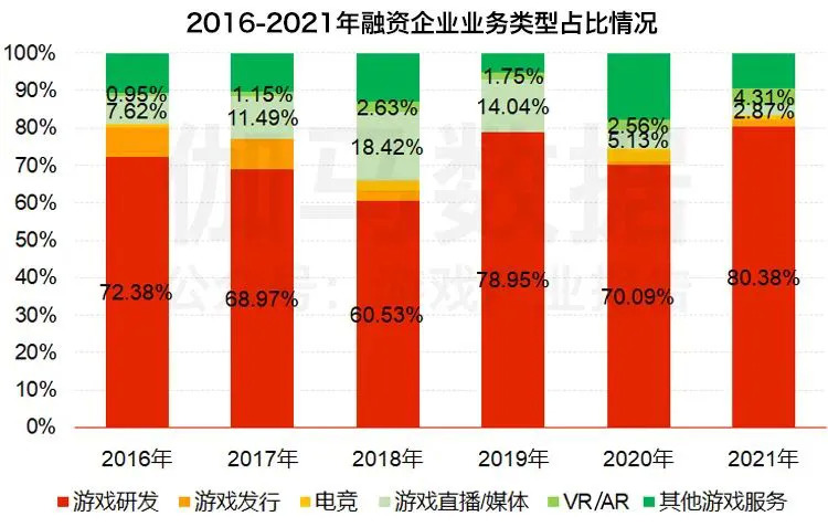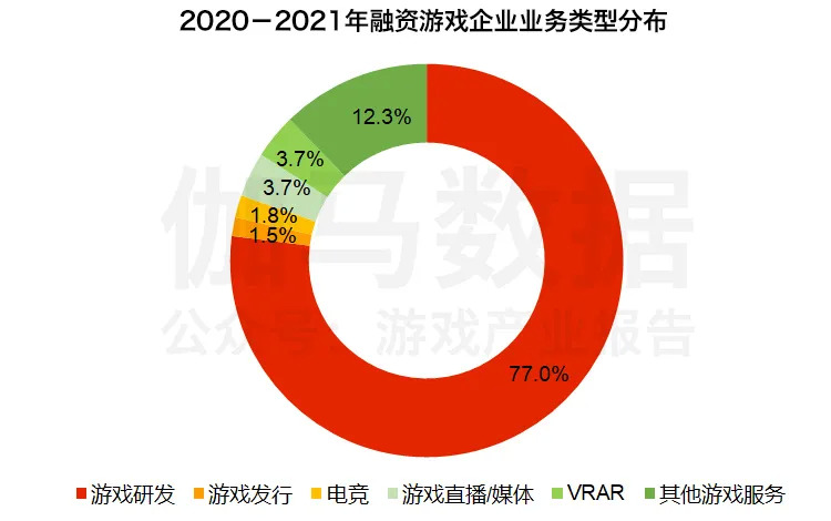 从伽马数据(CNG)对2020年至2021年游戏市场融资企业业务类型统计来看,在近两年,研发型的游戏企业依旧是投资方关注的重点,超七成的投资事件涉及到具备游戏研发能力的企业。