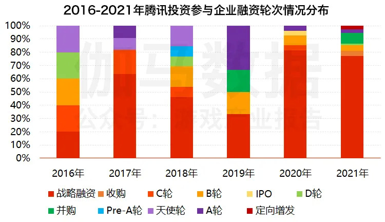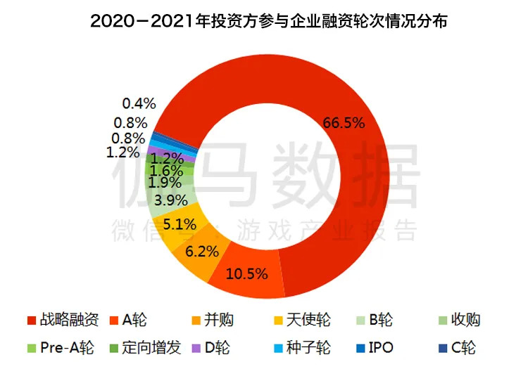 从伽马数据(CNG)对2020年至2021年游戏投资事件中投资方参与企业融资轮次的统计来看,在近两年,投资方更多的是通过战略投资的方式参与游戏相关企业的融资,现阶段游戏市场的投资方更看重战略协同效应,重点关注对自身业务的优化和拓展,更加强调与融资企业的合作关系。