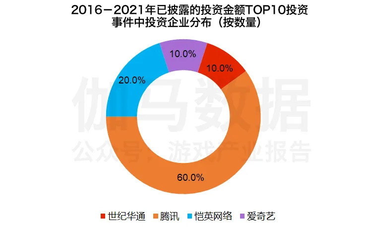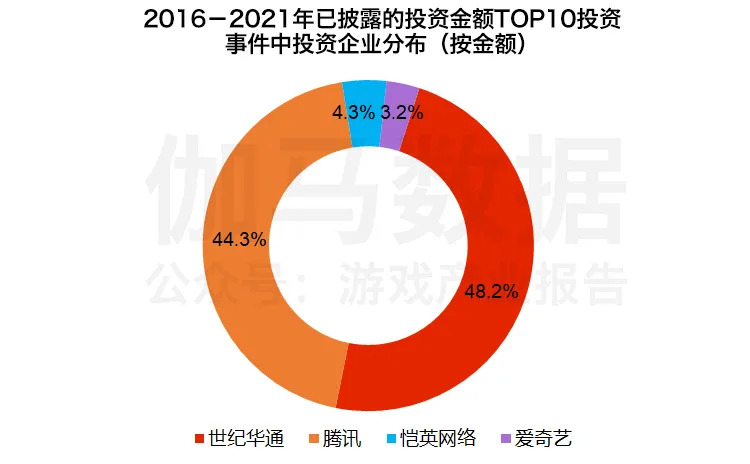 根据伽马数据(CNG)对2016年至2021年已披露的游戏市场投资金额的统计(不包括游戏企业对海外市场投资行为),投资金额TOP10的投资事件合计产生投资金额超过六百亿元,其中腾讯参与的投资事件数量占据六成。