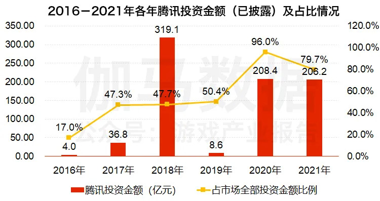 伽马数据(CNG)对2016年至2021年腾讯参与的投资事件数量以及已披露的投资金额进行统计,结果显示,进入2020年后腾讯针对于游戏市场的投资力度从数量和金额方面均有所加强,2021年腾讯参与的投资事件数量占整个游戏市场的44%,已披露的投资金额中腾讯占比接近80%,腾讯是近期游戏市场投资事件的重要推动者。