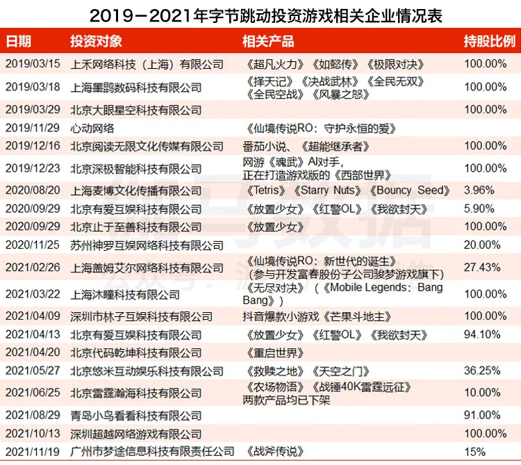 2019年,作为字节跳动旗下游戏业务确认品牌名为“朝夕光年”,聚焦中重度游戏的研发与发行。截止至2021年上半年,字节跳动在游戏市场的投资数目达到18件,其中多以战略投资及并购的方式参与企业融资。2021年上半年,朝夕光年接连收购有爱互娱、沐瞳科技等多家游戏企业,通过并购拥有成熟产品研发体系的游戏企业,提升自身游戏研发竞争力。另一方面,朝夕光年与海内外多家游戏厂商展开合作,通过代理产品的方式,加快自身在游戏市场业务的开展。