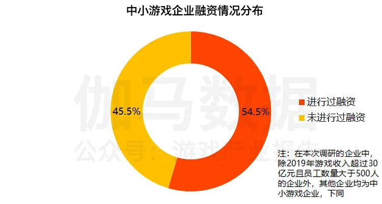 在伽马数据(CNG)调查的中小游戏企业中,有50.9%的企业表示资金周转情况良好,有12.7%的企业表示资金周转有困难。从融资情况来看有54.5%的企业进行过融资,有45.5%的企业未进行过融资。