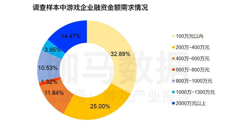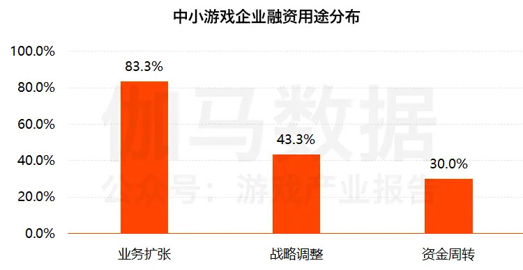 根据伽马数据(CNG)的调查,中小游戏企业融资主要用于业务扩张、战略调整及资金周转三个方面,其中83.3%的企业融资后用于业务扩张,除此之外融资后用于战略调整的企业占比为43.3%,用于自身资金周转的企业占比为30.0%。在伽马数据(CNG)调查有融资需求的样本企业中,超过三成的企业所需的融资金额在100万元以内。