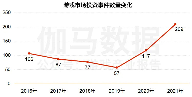 根据伽马数据(CNG)对2016年至2021年游戏市场投资事件数量的统计,2021年,中国游戏领域共发生投资209起,总金额约258.8亿元人民币。近两年来,游戏市场投资的活跃度明显加强。