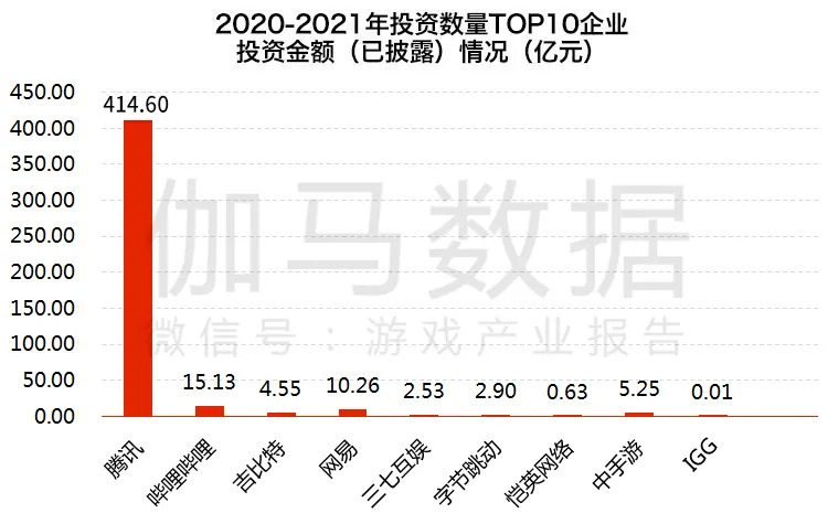 根据伽马数据(CNG)对2020-2021年投资数量TOP10企业中已披露的投资金额统计,腾讯在游戏投资市场的资金投入超过400亿元,远高于其他游戏企业。
