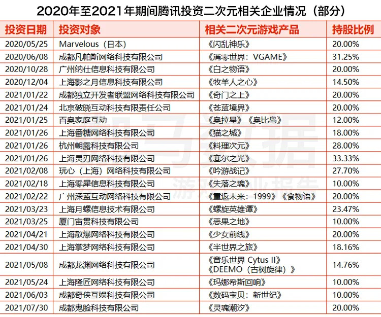 从近五年腾讯投资所参与的企业融资轮次来看,进入2020年后,腾讯主要是通过战略投资的方式布局各游戏细分赛道。所投资的游戏企业产品信息显示,二次元成为腾讯重点投资的游戏领域,根据伽马数据(CNG)对市场公开信息的统计,腾讯在2020年至2021年期间,投资超过20家有二次元相关游戏产品研发业务的企业,二次元是头部游戏企业重点关注的游戏领域。
