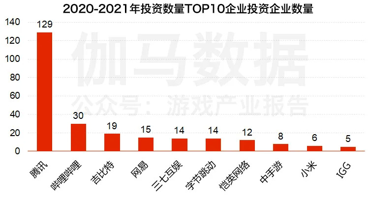 根据伽马数据(CNG)对2020年至2021年游戏市场投资事件数量的统计,2020年以来,腾讯在游戏市场的投资活跃程度从数量和频率上来看明显高于其他游戏企业。