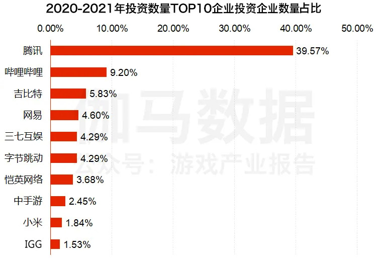 投资数量TOP10企业的投资行为占市场投资总数比例超过六成,其中腾讯在游戏市场的投资金额和活跃程度遥遥领先