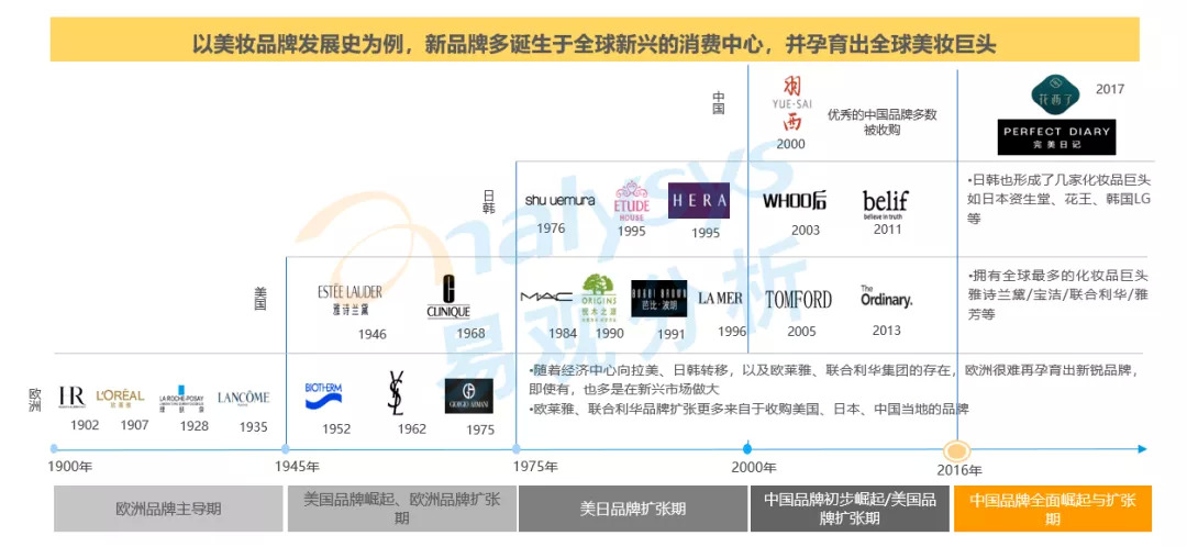 “新消费”是指由数字技术等新技术、线上线下融合等新商业模式以及基于社交网络和新媒介的新消费关系所驱动之新消费行为。随着全球消费重心转移,中国将成为新的世界级品牌孕育中心,以美妆品牌发展史为例,新品牌多诞生于全球新兴的消费中心,并孕育出全球美妆巨头。