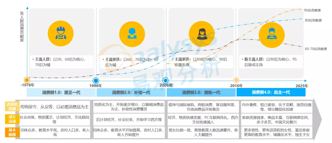 不同年代的人群,由于宏观环境、成长环境等不同,基本画像和消费价值观也展现出了很大的差别。几十年来,随着社会不断发展,如今的年轻人和过去相比,发生了很大的变化。