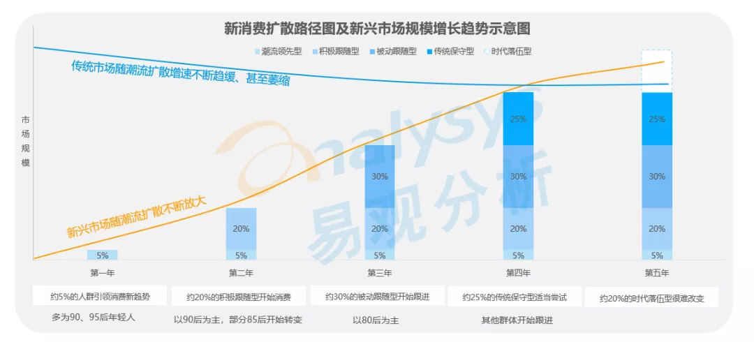 如今传统市场随潮流扩散增速不断趋缓、甚至萎缩,而新兴市场随潮流扩散不断放大。需要注意的是,不同行业及不同的细分市场,潮流扩散的速度和程度都不尽相同,需要部分潮流领先者先使用,逐步引领积极跟随型、被动跟随型、传统保守型消费者慢慢接受和使用新型产品,开拓新兴市场。