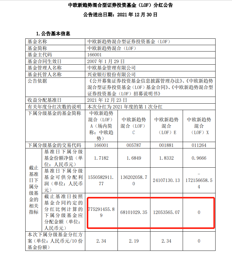 2021年,中欧新趋势混合的回报率为1%左右,12月30日基金给投资者送出了超级大礼包,合计分红金额高达8.5亿元。其中,A/E份额每10份分红2.34元,C份额每10份分红2.19元。
