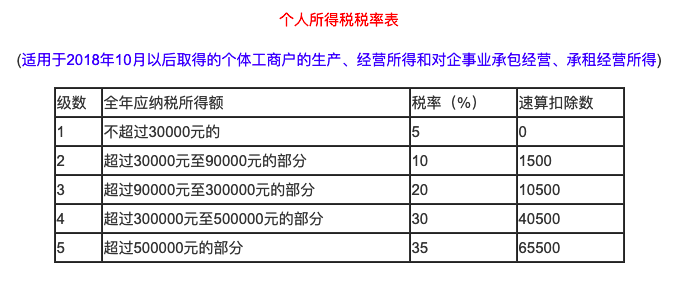 假如一家个人独资企业一年的营业额为100万,假设成本为0,那么在核定征收方式下要缴纳的个人所得税为9500元,计算公式为:1000000*10%*20%-10500,其中,10%是利润率,20%是10万元利润(应纳税额)适用的个人所得税税率,10500是速算扣除数。(见插图)而在查账征收方式下,该企业应纳税额为100万,须缴纳个税28.45万元。两种不同方式缴纳的个税相差近30倍。