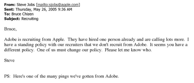 谷歌是苹果最担心的对手。2005年2月,乔布斯两次给谷歌创始人谢尔盖·布林发邮件,指责谷歌公司试图挖走苹果Safari团队成员,并表示挖墙脚的行为意味着战争。收到邮件后,布林立刻通知相关人员,停止从苹果挖人的行动。
