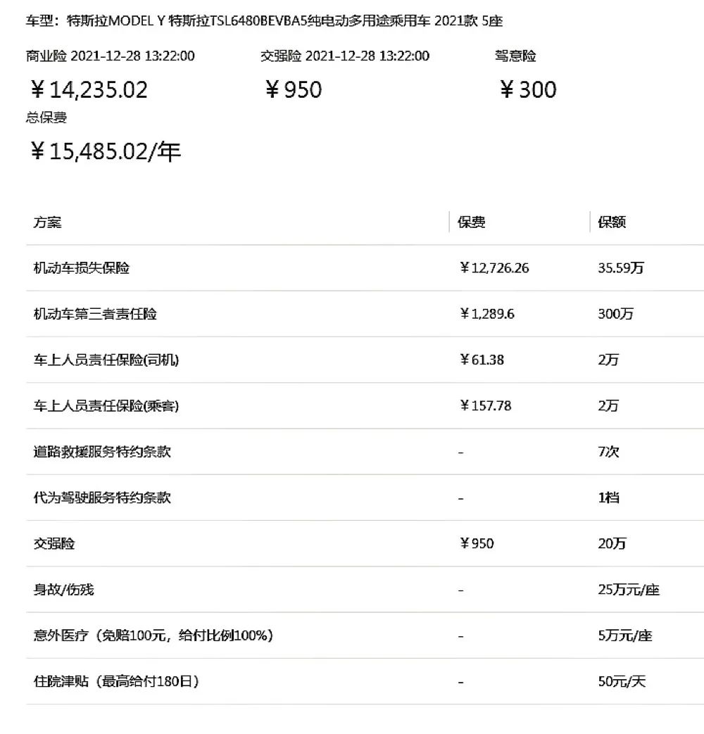 2021年12月28日,有网友曝出一份特斯拉Model Y的“天价”保单。该保单中显示2021款特斯拉TSL6480BEVBA5纯电动多用途乘用车(特斯拉Model Y长续航版)的商业险价格为14235.02元,交强险为950元,该车总保费达到15485.02元/年。