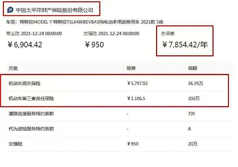 2021年12月24日,也有网友在某论坛上发布了特斯拉Model Y长续航车型的保单,保单上面的总保费为7854.42元/年,其中机动车损失险的保费为5797.92元,保额为36.39万元,车损险的价格比2021年12月28日的报价的一半还要少。