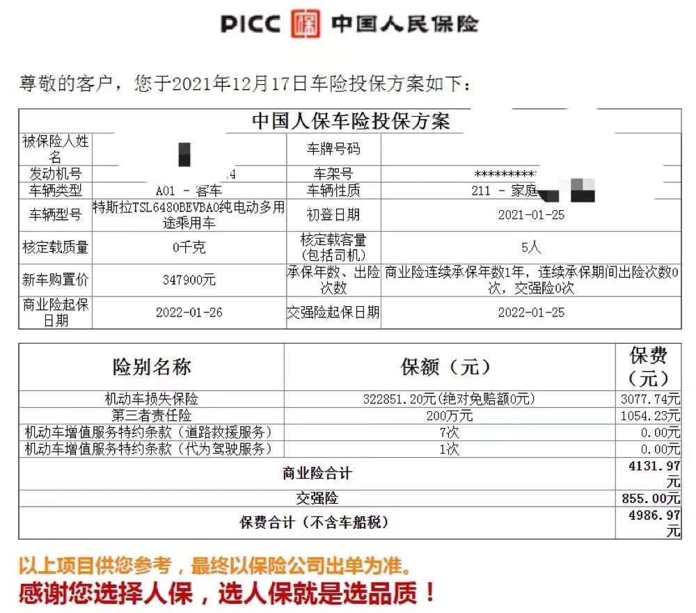 时间再往前推一周,2021年的12月17日,也有网友贴出了自己的保单,受保车辆仍为特斯拉Model Y长续航版,其保费合计仅为4986.97元/年,几乎是12月28号保费报价的三分之一。但是,从该网友披露的保单来看,该保单是属于车辆的第二年投保,并且该车在过去一年并没有出险记录,所以该保单价格相对而言比较低,但是也能一定程度上反映当时的保费价格水平。