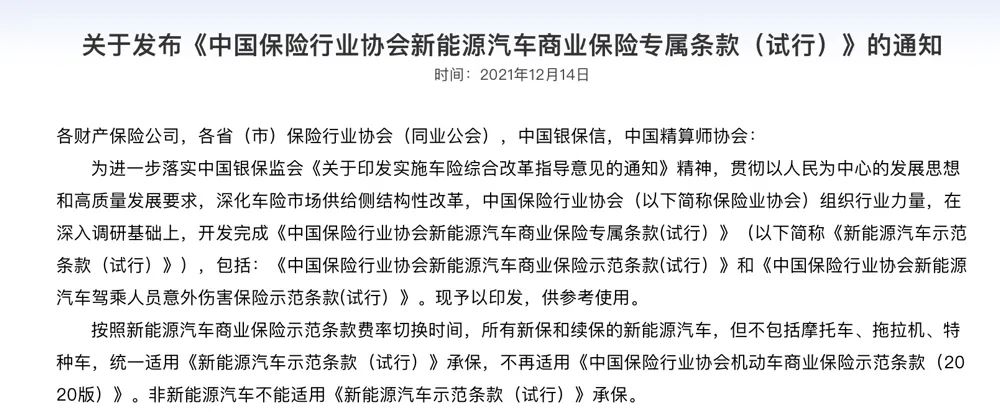 2021年12月14日中国保险行业协会发布《新能源汽车商业保险专属条款(试行)》后,新能源汽车的商业保险价格还没有“起飞”,在一段时间内仍保持在原来的水平。