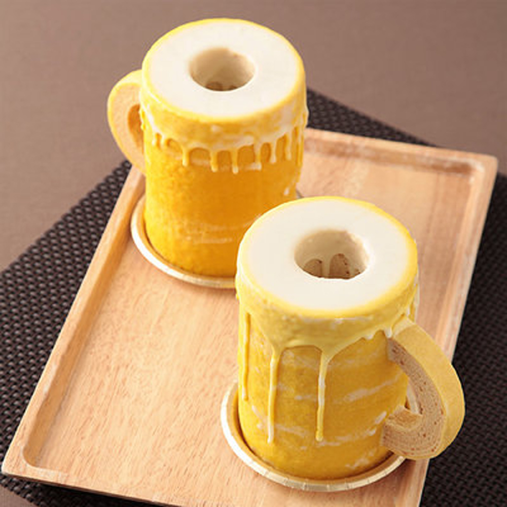 家里的爸爸是不是常常晚饭的时候小酌一杯,如果觉得喝酒伤身又想给爸爸一个惊喜的话不如拿出这样的“啤酒”蛋糕。日本几个蛋糕品牌出了几款长得像啤酒的蛋糕,用奶油代替白沫,蛋糕胚代替啤酒,中间放几颗小草莓。这些蛋糕不好在网上买到,但有心的你不妨在父亲节来临之际亲手做一个,跟爸爸别致地“碰杯”。