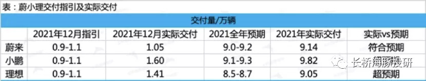 按照蔚小理11月时候给出的四季度销量展望来倒推,三个公司12月份的交付数据均在0.9-1.1万辆左右。实际交付数据只有蔚来落在预期之内,而小鹏和理想均大幅超出预期。