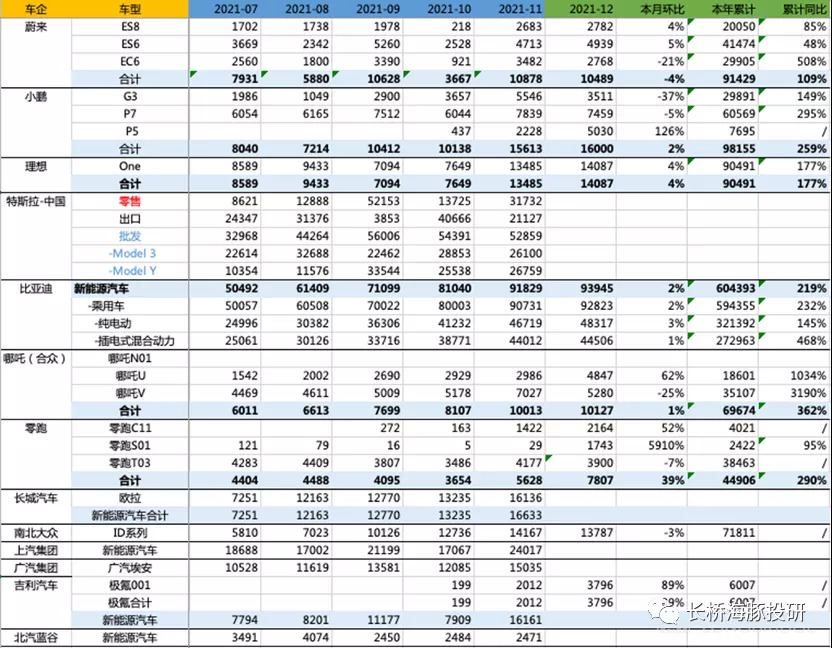 看似吊炸天的成绩,大多都在预期之内,偶尔几家比如“小理”,成绩超预期有点严重。通过各家车企数据的对比,长桥海豚君可以明显可以感受到新能源车渗透率快速拔高的阶段,赛道的的朝阳特征——百花齐放、百家争鸣;而且,2022年新车会持续密集发布,这都为2022年新能源车市的高增长奠定了基础。